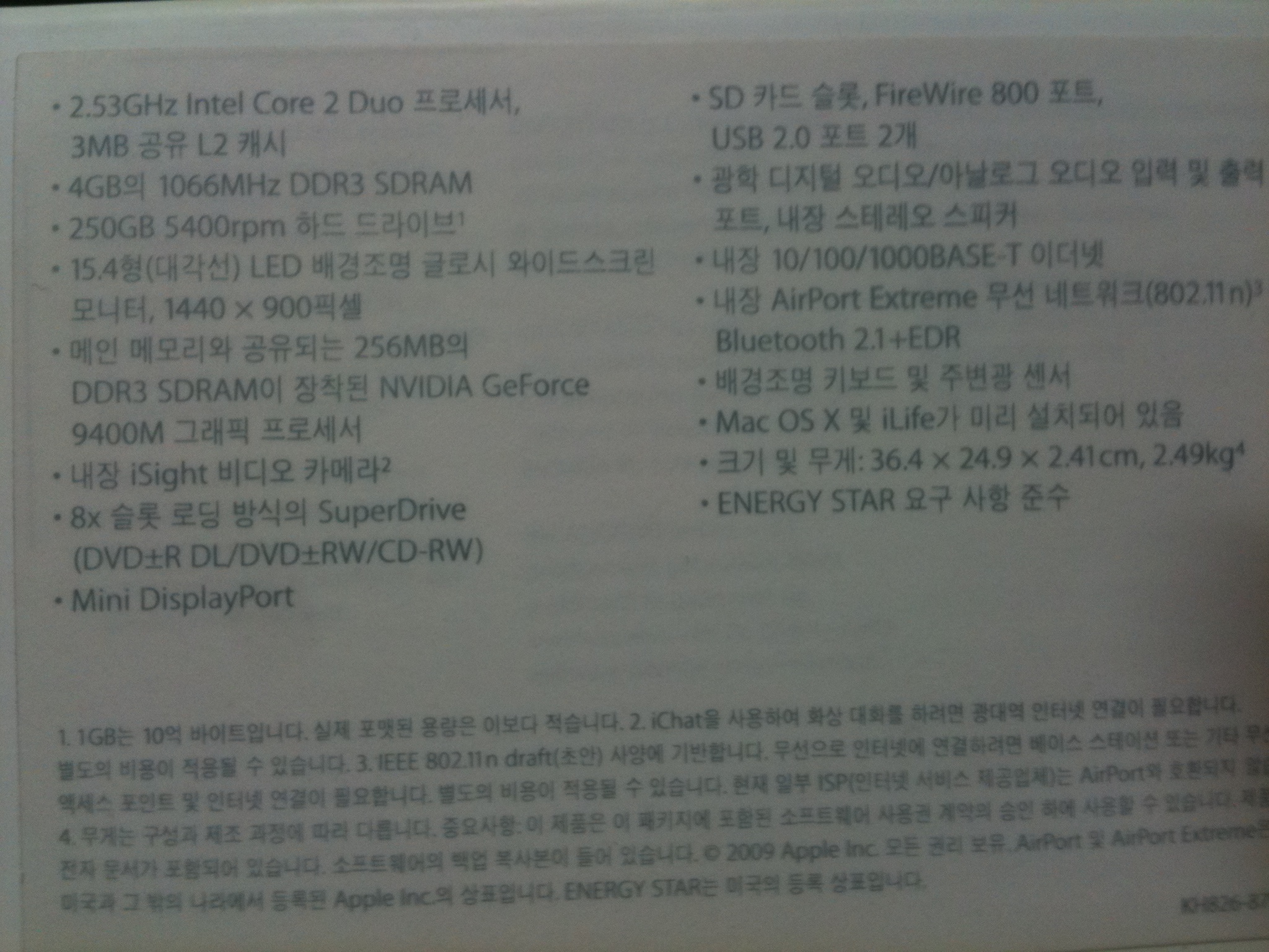 Intel(R) Core(TM)2 Duo CPU 2.53GHz / 메모리 4.00GB / 하드디스크 250GB / NVIDIA GeForce 9400M(박스는 있는데